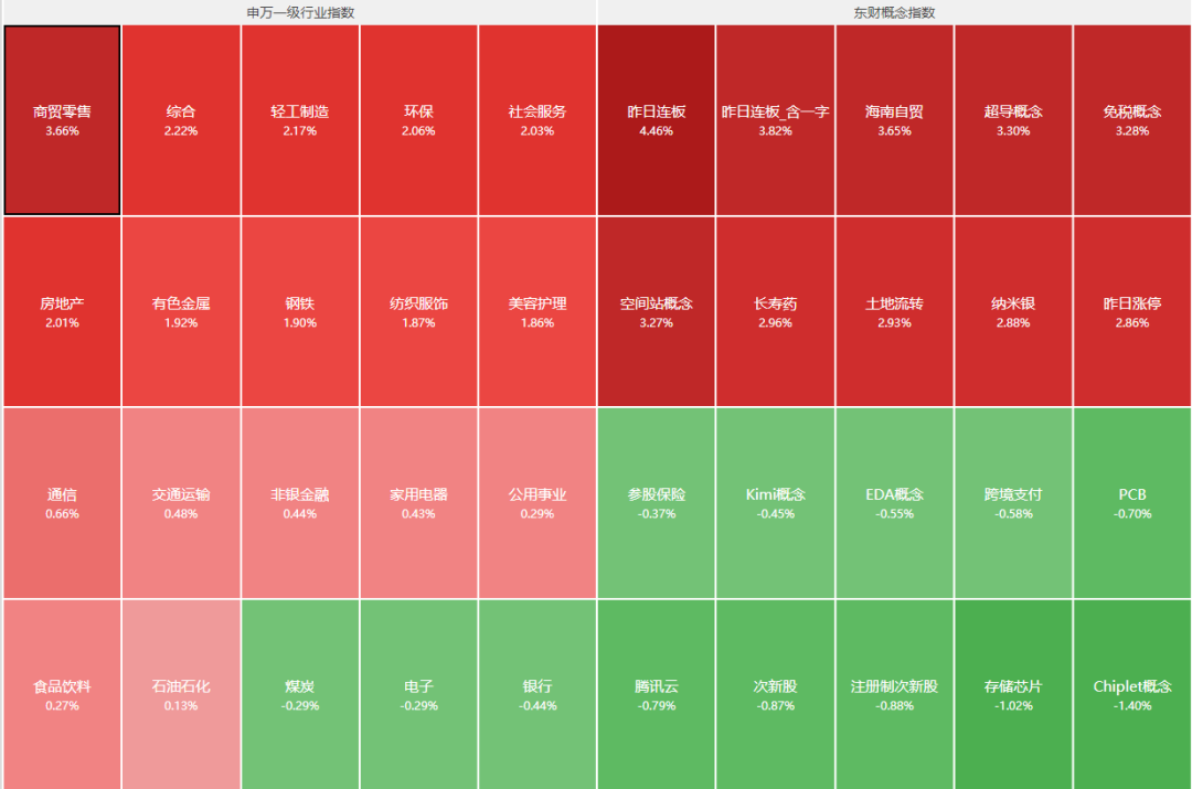 分行業(yè)來來看,商貿(mào)零售、綜合、輕工制造、環(huán)保、社會服務等行業(yè)領漲,銀行、電子、煤炭三大行業(yè)下跌。