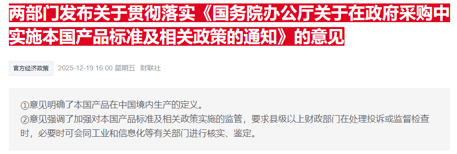 財政部、工業(yè)和信息化部發(fā)布關于貫徹落實《國務院辦公廳關于在政府采購中實施本國產(chǎn)品標準及相關政策的通知》的意見,其中提到,在政府采購中實施本國產(chǎn)品標準及相關政策,是一項長期性、系統(tǒng)性工作。各地區(qū)各部門要提高站位,準確把握本國產(chǎn)品標準及相關政策的核心內(nèi)涵,進一步增強責任感和使命感,將《通知》要求落實落細落到位。