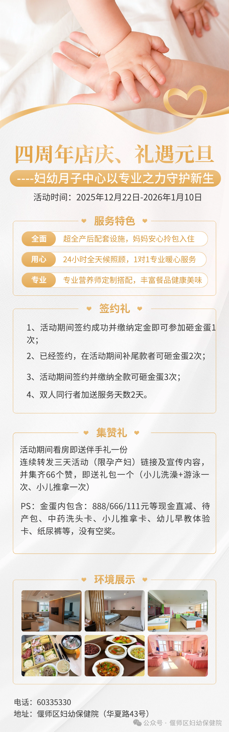 每周一、周四主任大查房(產科、兒科、兒保、產康)、護士長每日查房、一對一母嬰護理師24小時貼心式服務、搭配產后康復師的專屬定制服務,以醫養結合、養教結合,滿足廣大寶媽“坐月子、有醫靠”的需求。
