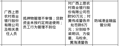 針對(duì)上述違法違規(guī)行為,國(guó)家金融監(jiān)督管理總局防城港監(jiān)管分局對(duì)其罰款90萬(wàn)元;對(duì)黃偉成警告并處罰款6萬(wàn)元;分別給予梁明訓(xùn)、方俊星、馬松余、黃海清警告。