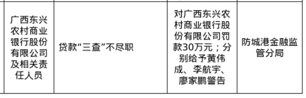 針對上述違法違規行為,國家金融監督管理總局防城港監管分局對其罰款30萬元;分別給予黃偉成、李航宇、廖家鵬警告。