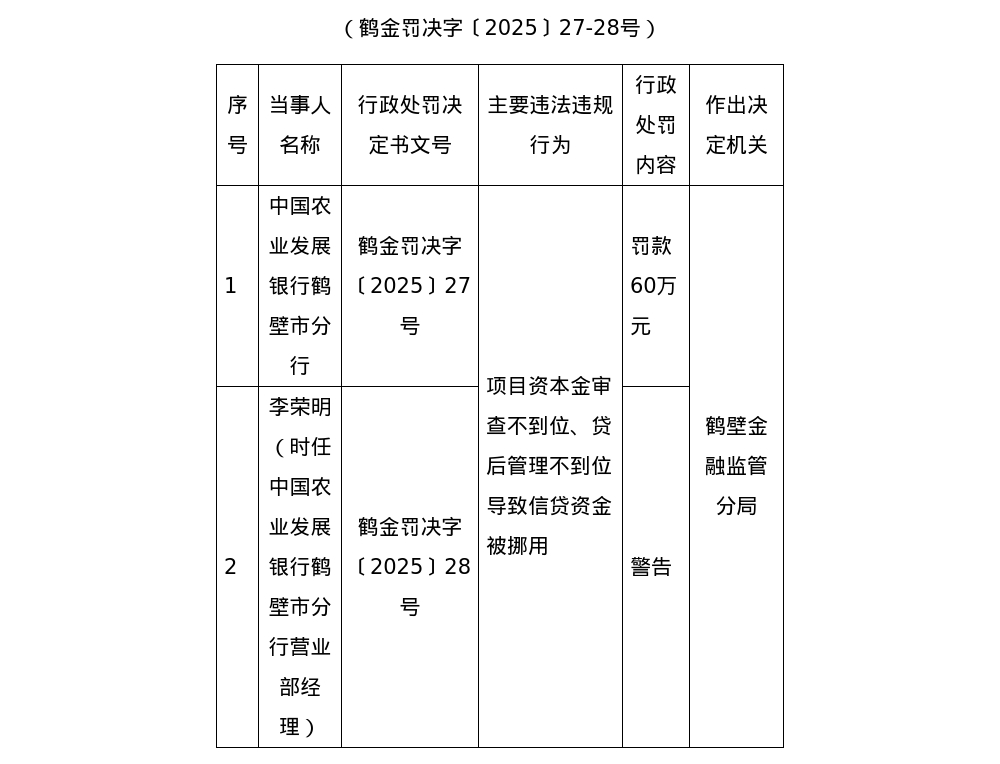 針對上述違法違規行為,國家金融監督管理總局鶴壁監管分局對其罰款60萬元;對李榮明(時任中國農業發展銀行鶴壁市分行營業部經理)警告。