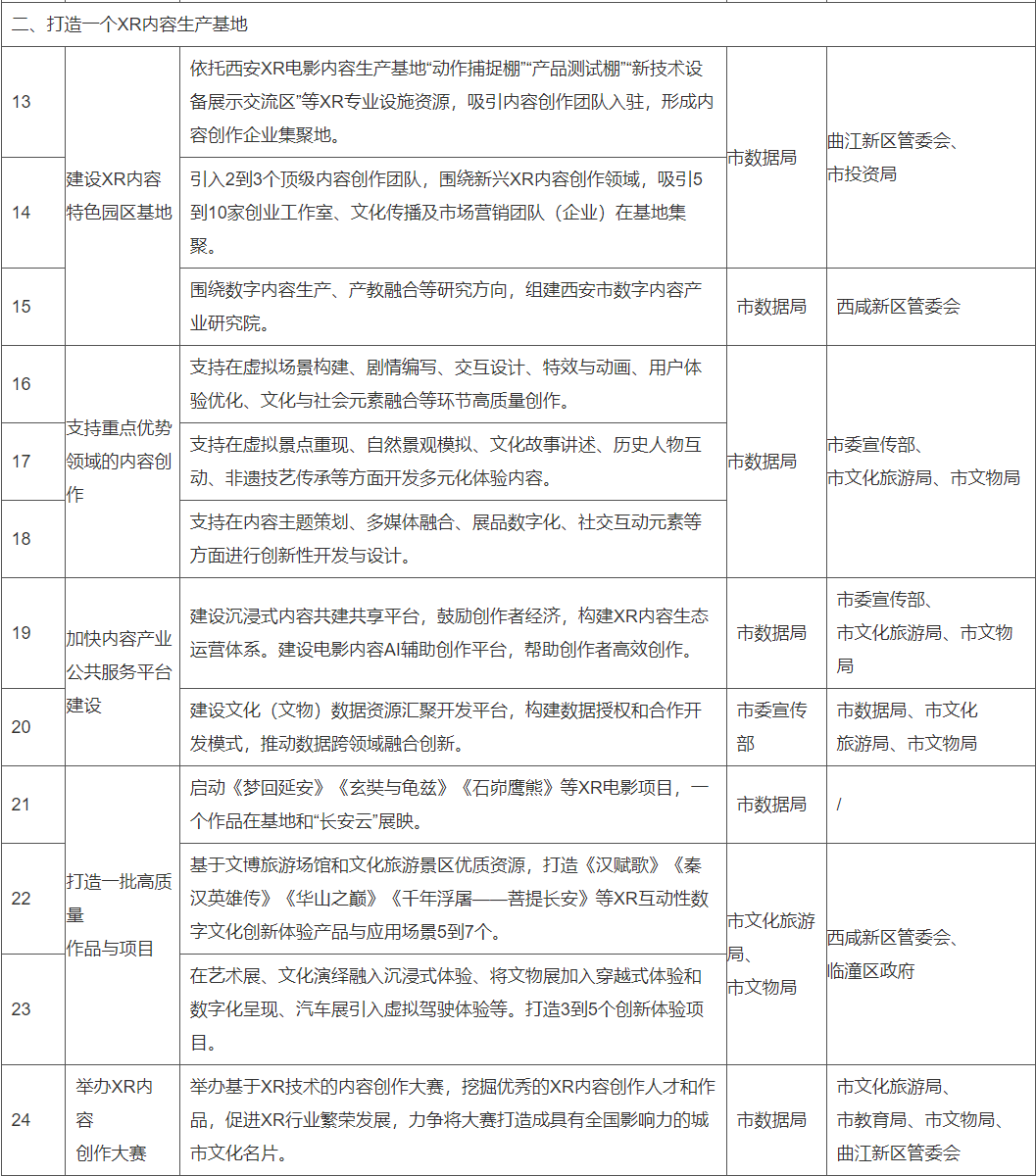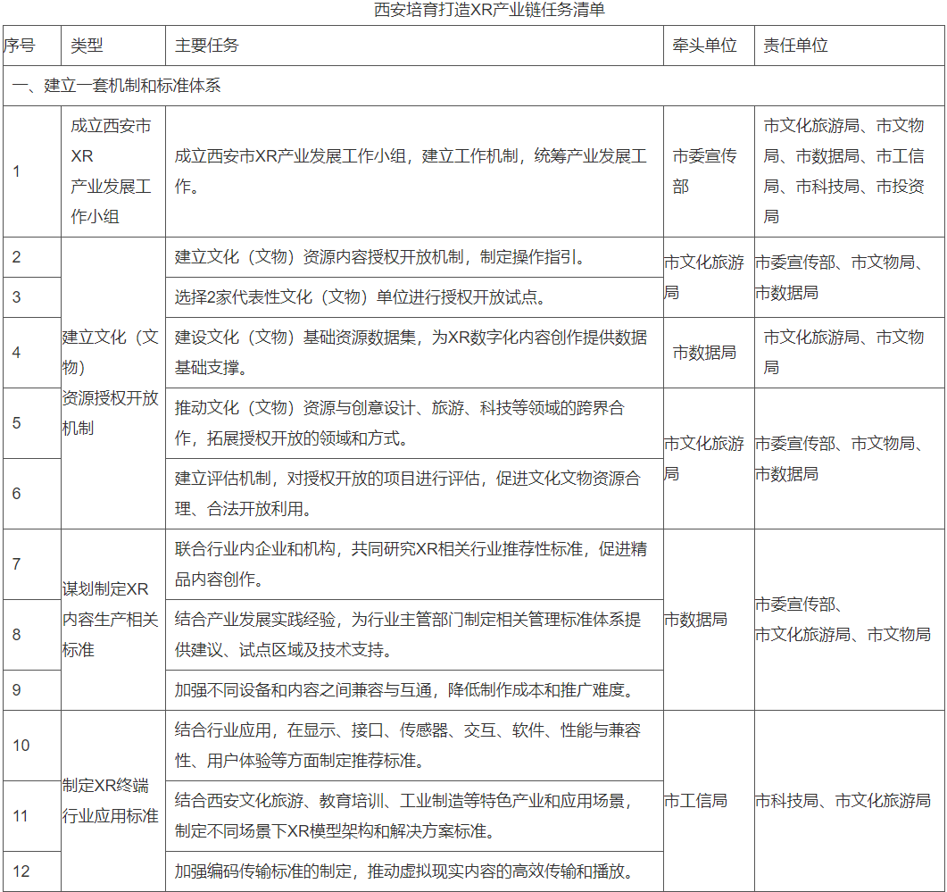 1.成立西安市XR產業發展工作小組。積極爭取國家和省上政策支持,整合各方資源,由市委宣傳部牽頭,會同市文化旅游局、市工信局等相關部門,成立西安市XR產業發展工作小組,建立工作機制,對產業發展工作和各相關單位、企業實施科學有效的組織統籌。(責任單位:市委宣傳部、市文化旅游局、市文物局、市數據局、市工信局、市科技局、市投資局)