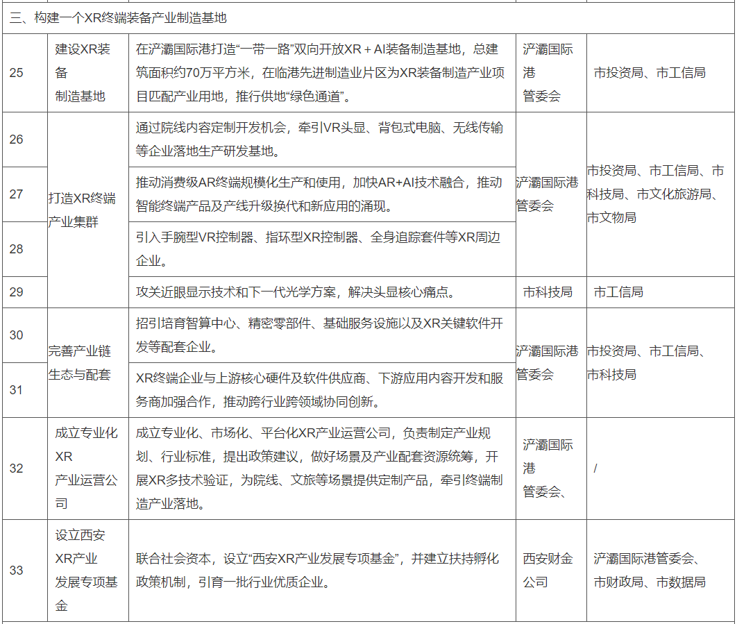 3.成立專業化XR產業運營公司。以運營為核心,產業落地為目的,探索成立專業化、市場化、平臺化XR產業運營公司。作為政府發展XR產業的代表方,提出政策意見,做好場景統籌,牽引終端制造產業落地。開展XR多技術驗證,為院線、文旅等場景提供定制產品。負責制定產業規劃、行業標準,統籌產業配套資源,促進產業發展。(責任單位:浐灞國際港管委會)