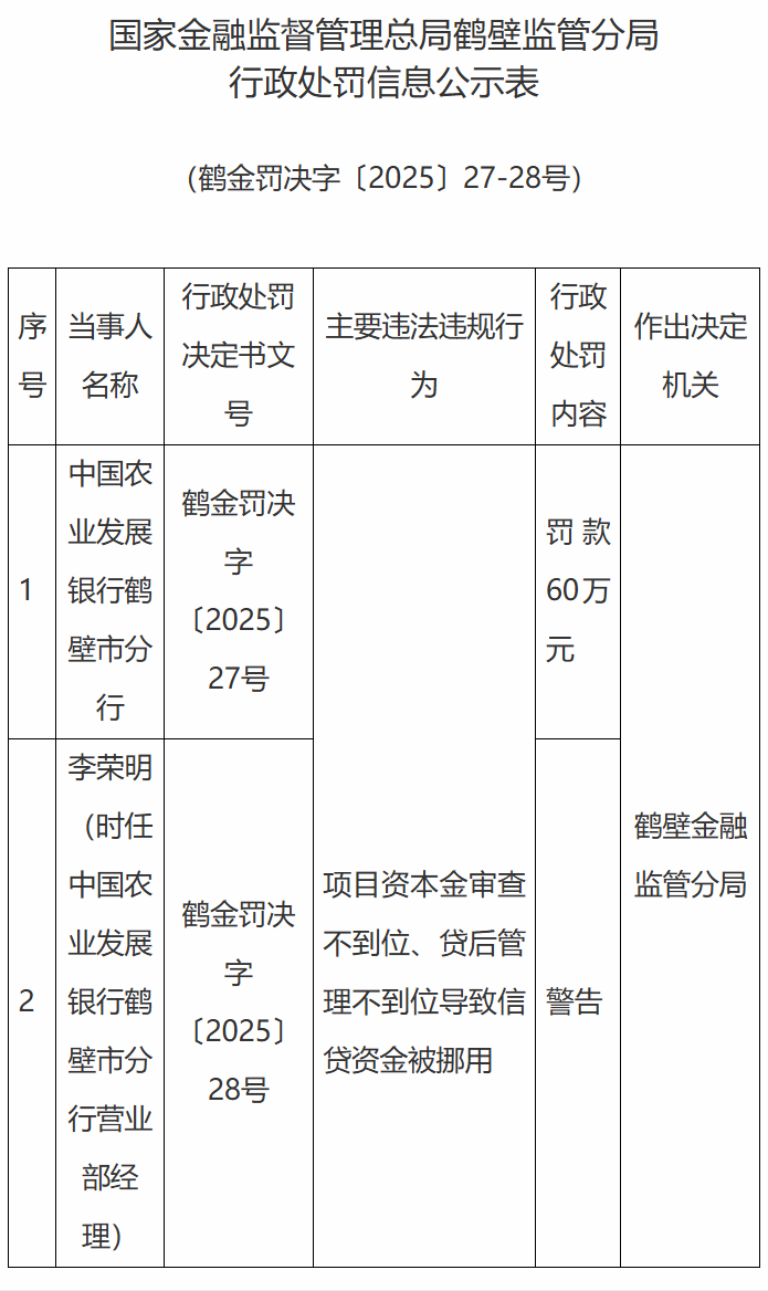 【大河財立方消息】12月19日,國家金融監督管理總局鶴壁監管分局披露的行政處罰信息公示表顯示,因項目資本金審查不到位、貸后管理不到位導致信貸資金被挪用,中國農業發展銀行鶴壁市分行被罰60萬元。