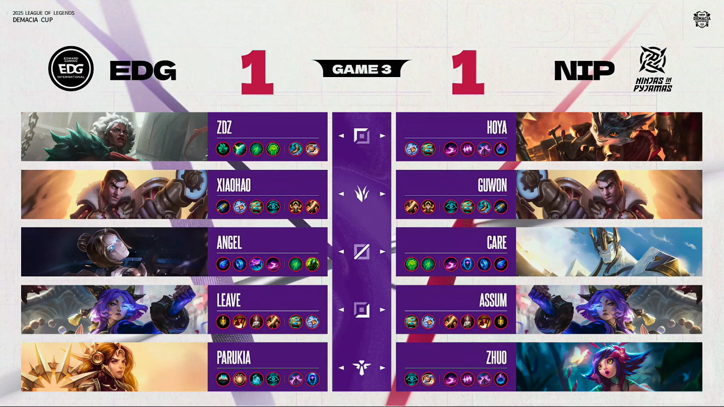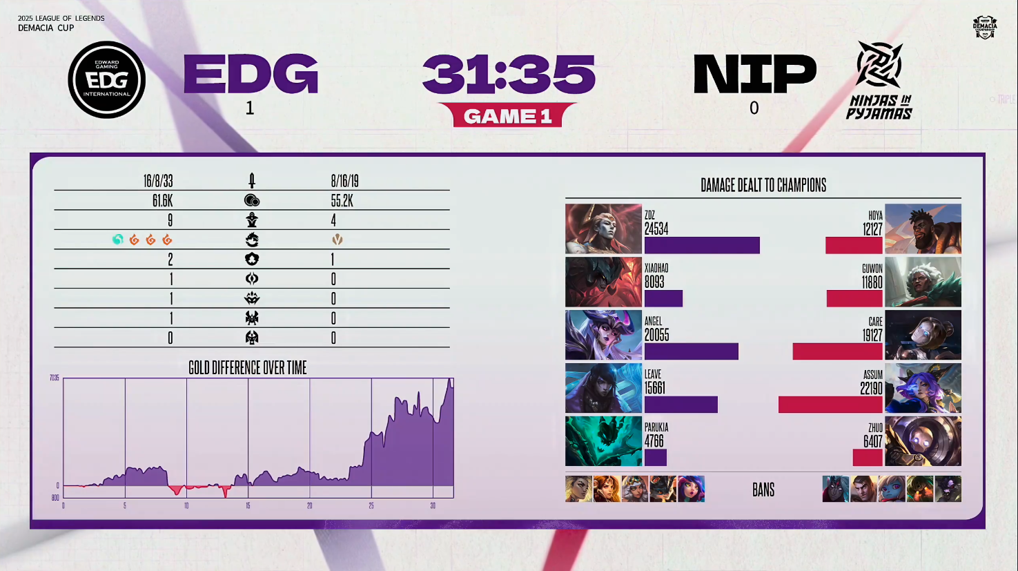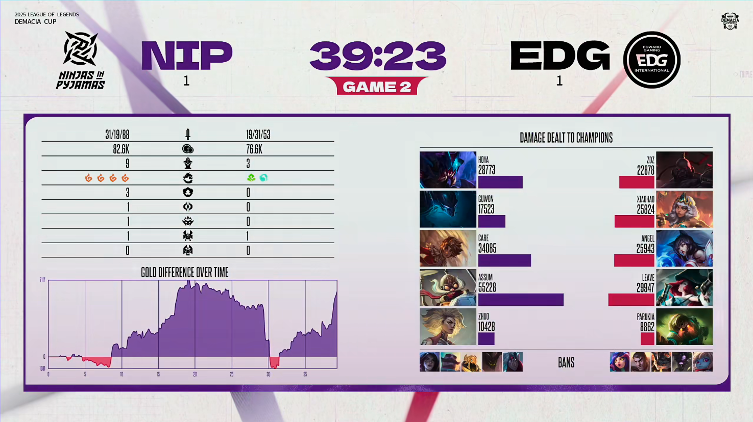 第一局比賽,EDG藍色方,禁用:妮蔻、蘭博、奇亞娜、蕾歐娜、芮爾,選用:Zdz亞恒、Xiaohao劍魔、Angel辛德拉、Leave厄斐琉斯、Parukia錘石;NIP紅色方,禁用:韋魯斯、杰斯、波比、泰坦、牛頭,選用:HOYA奎桑提、Guwon安蓓薩、Care發條、Assum蕓阿娜、Zhuo機器人