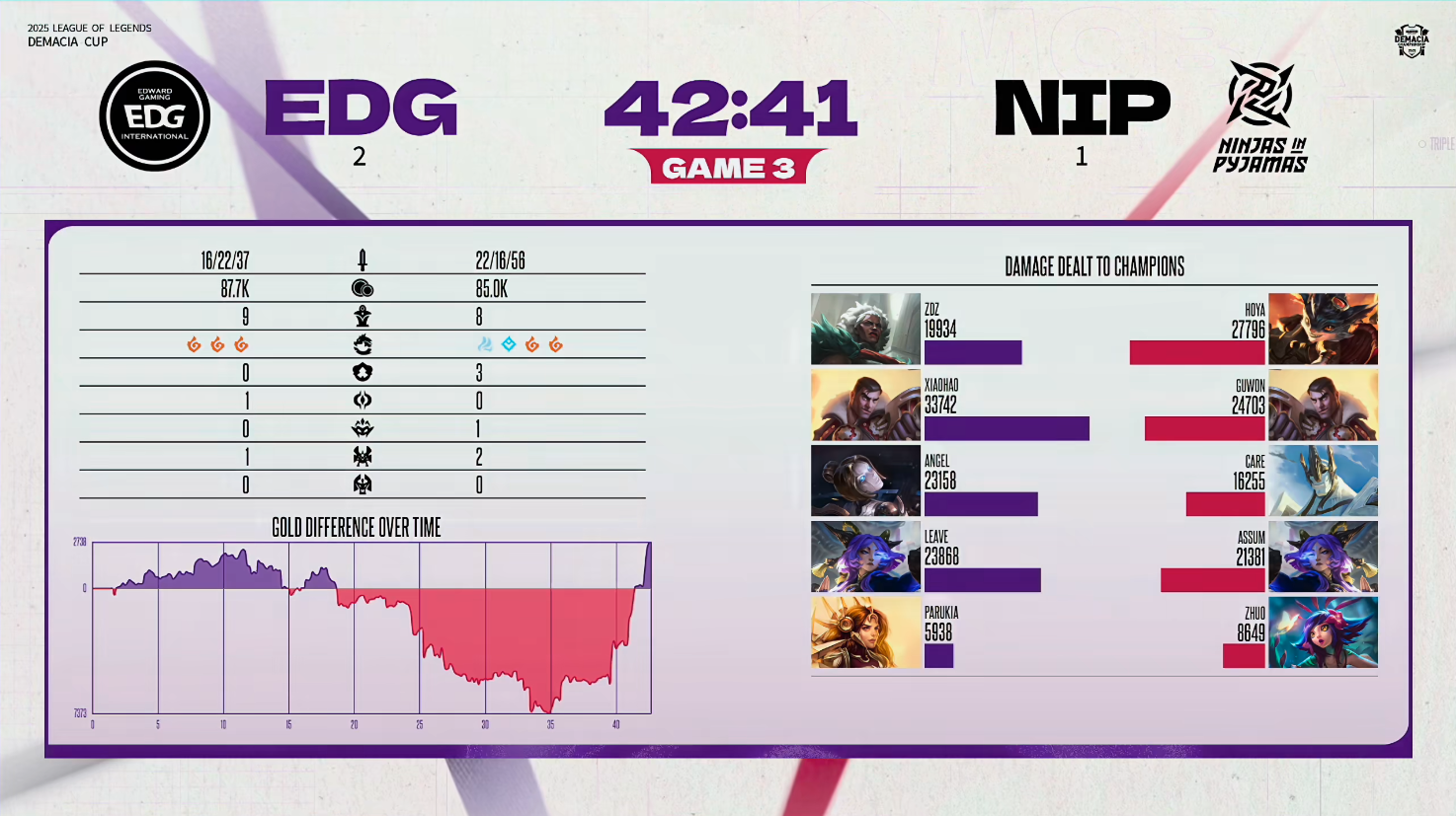 最終EDG拒絕讓一追二,艱難擊敗NIP,獲得勝利。