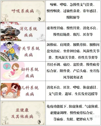 4. ?風濕骨病:關節痛、骨質增生、關節炎、風濕引起的各類頸、肩、腰、腿痛,遇寒加重、活動受限者可緩解不適;