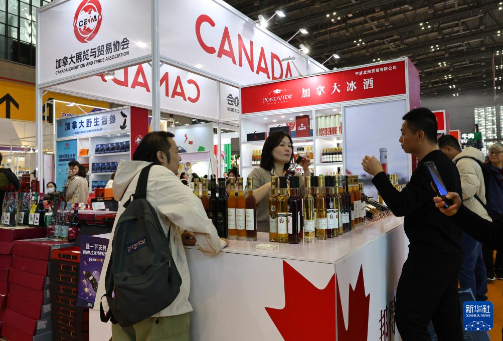 12月19日,參觀者在加拿大商品展臺前與工作人員交流。