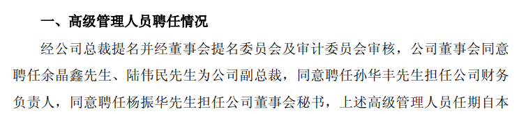公告顯示,中控技術股份有限公司12月17日召開第六屆董事會第十六次會議,審議通過了《關于聘任副總裁的議案》《關于聘任財務負責人的議案》《關于聘任董事會秘書的議案》。經公司總裁提名,公司董事會同意聘任余晶鑫、陸偉民為公司副總裁,孫華豐擔任公司財務負責人,楊振華擔任公司董事會秘書。上述高級管理人員任期自本次董事會審議通過之日起至第六屆董事會任期屆滿之日止。