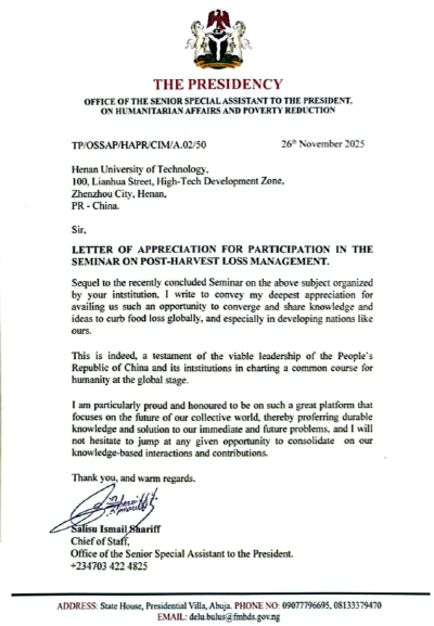 近日,尼日利亞總統府向河南工業大學發來感謝信,對該校在10月10日至30日期間承辦的“非盟國家糧食產后安全研修班”進行高度贊揚并表示感謝。該感謝信由尼日利亞總統首席幕僚薩利蘇?伊斯梅爾?沙里夫親筆簽署。