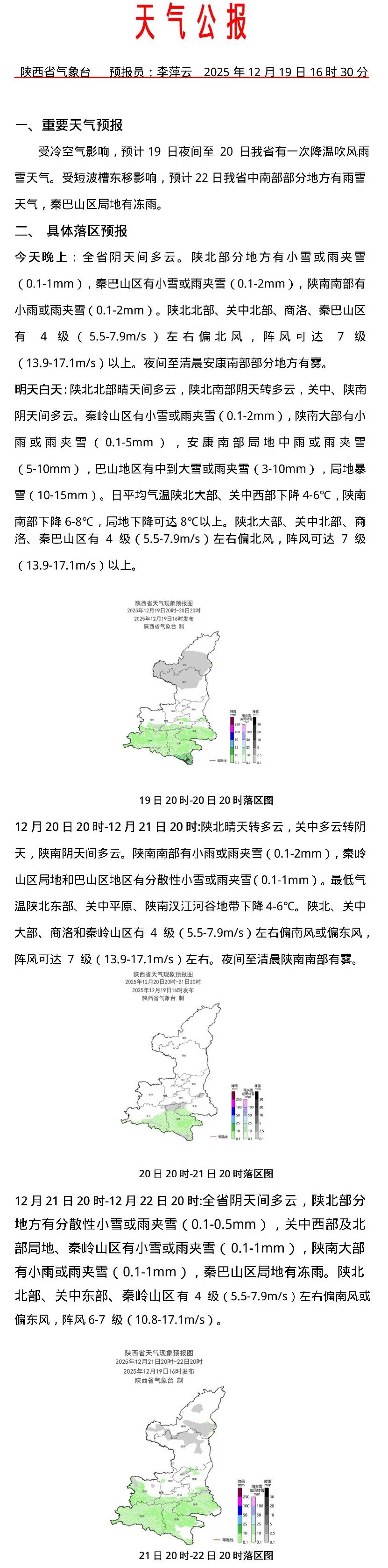 受冷空氣影響,預計19日夜間至20日我省有一次降溫吹風雨雪天氣。受短波槽東移影響,預計22日我省中南部部分地方有雨雪天氣,秦巴山區局地有凍雨。