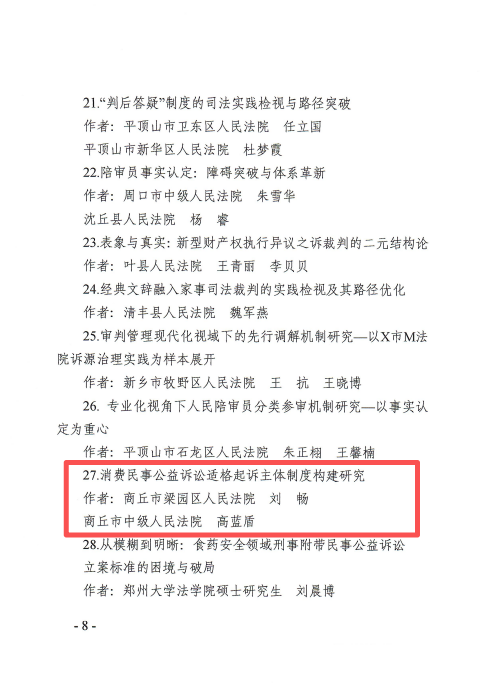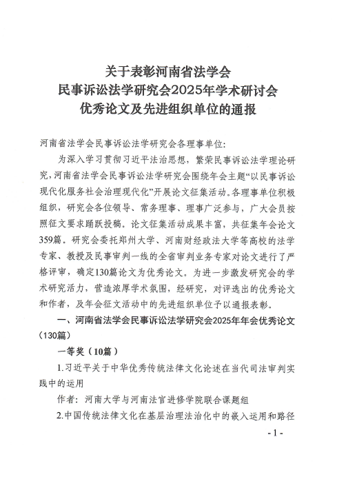 喜報!近日,河南省法學會民事訴訟法學研究會通報表彰優秀論文,梁園區人民法院法官劉暢與商丘市中級人民法院高藍盾聯合撰寫的學術論文《消費民事公益訴訟適格起訴主體制度構建研究》經專家嚴格評審,榮獲2025年學術研討會三等獎。