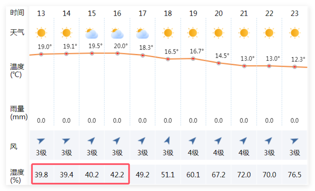 不過午后相對濕度只有40%左右,空氣干燥,提醒您注意補水保濕。