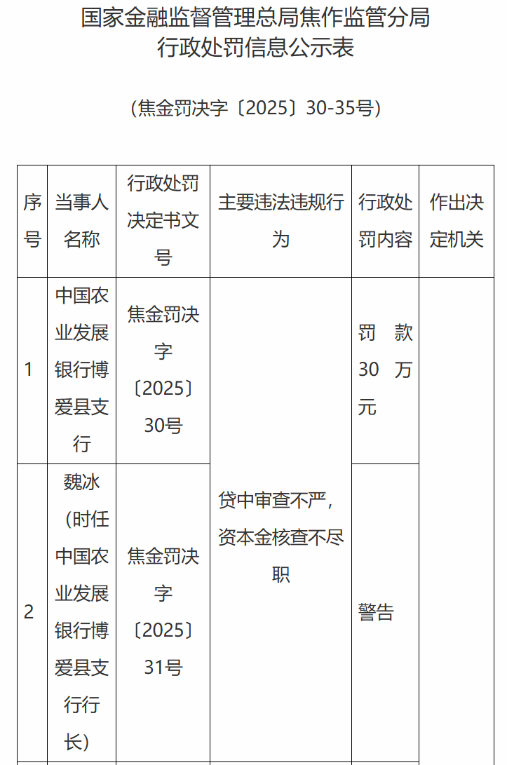 同時,焦作金融監管分局對時任中國農業發展銀行博愛縣支行行長魏冰警告。
