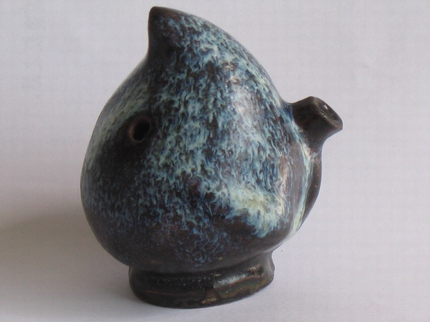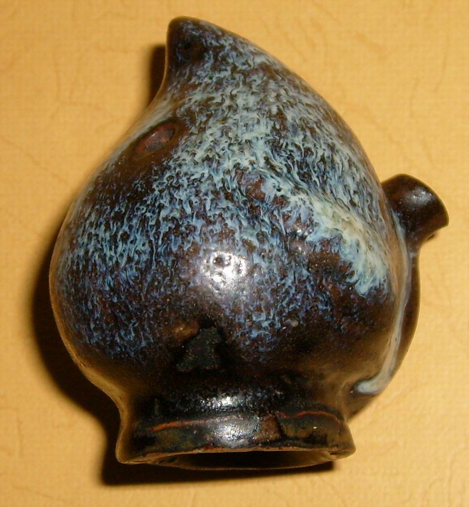 1998年,在天津沈陽道古玩市場發(fā)現(xiàn)了一件早年窖藏的五代花釉鈞瓷桃形硯滴,高僅6厘米,通體施天藍(lán)色帶乳白、淺灰色鈞釉,釉質(zhì)乳光瑩潤,胎質(zhì)為香灰色。底足露醬褐色護(hù)胎釉,采用墊燒工藝,釉面呈現(xiàn)"蚯蚓走泥紋"雛形。這件硯滴與同出的小銅鏡、青玉墜、三彩瓜形硯滴等器物共同裝于一只藍(lán)色陶罐內(nèi),推斷為五代窖藏瓷器。