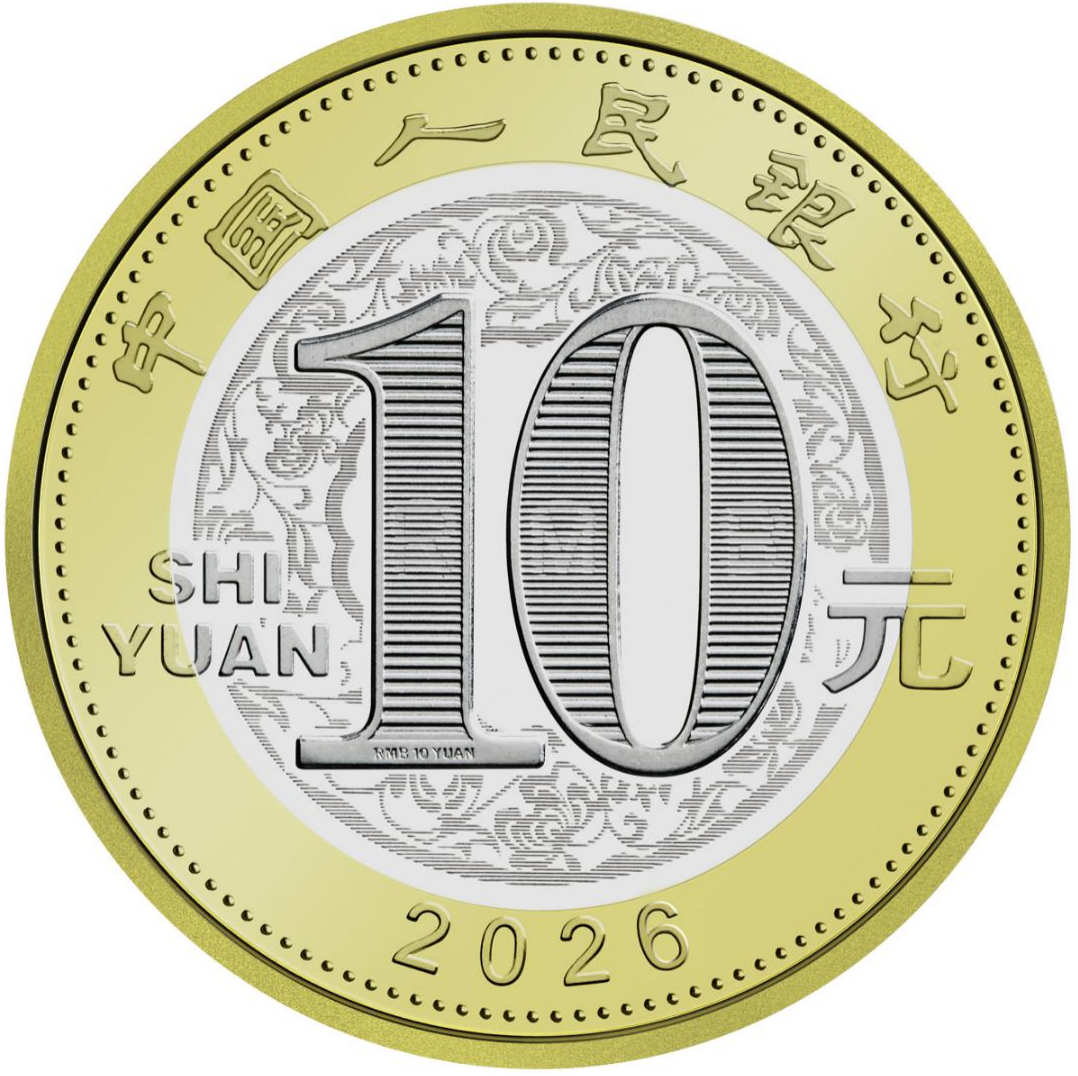 雙色銅合金紀念幣正面圖案為“中國人民銀行”、“10元”字樣,漢語拼音字母“SHIYUAN”及年號“2026”,底紋襯以團花圖案。