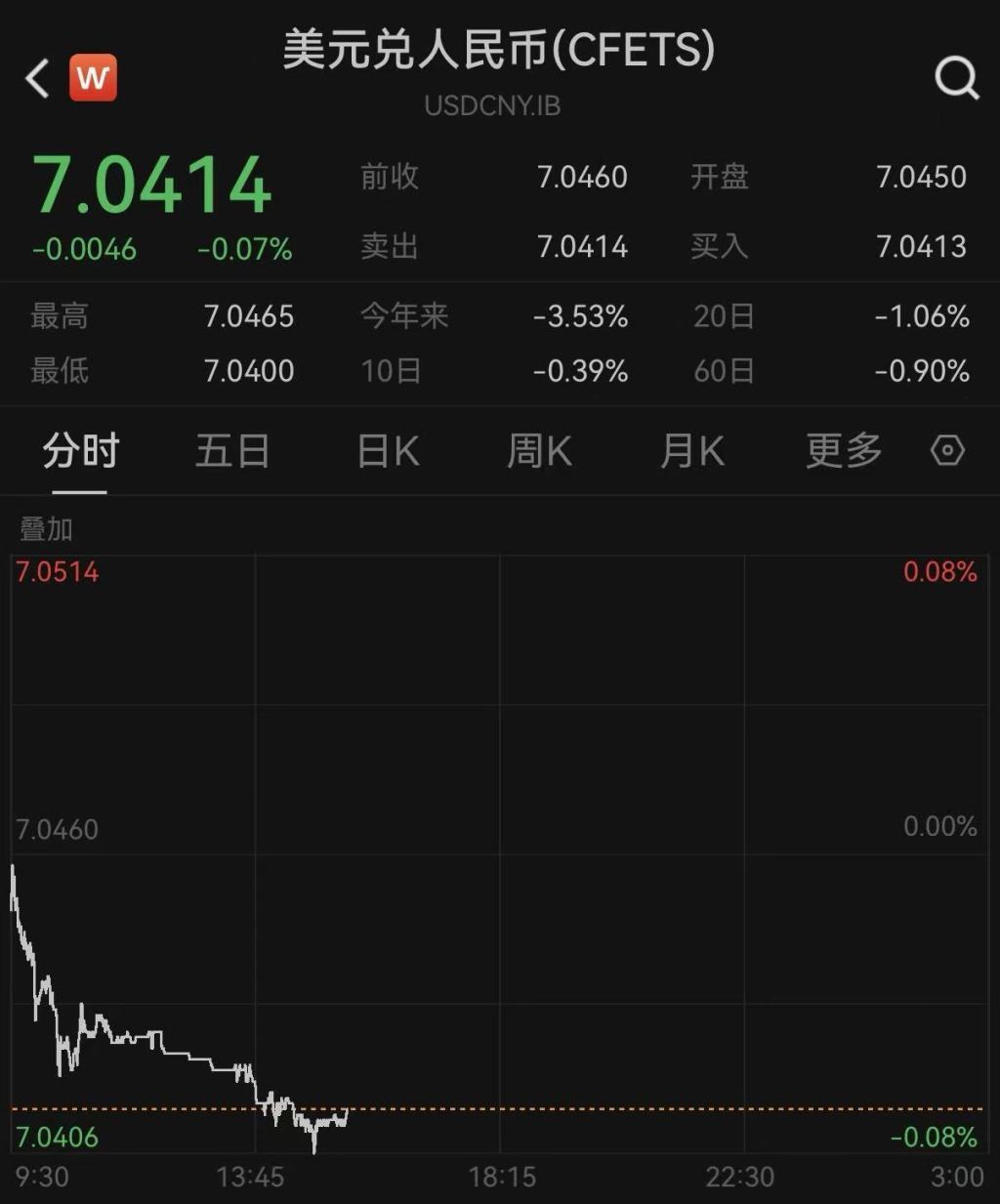 12月18日,人民幣對美元即期匯率開盤報7.0450,盤中最高升至7.0400,突破前期高點(12月16日盤中最高升至7.0410),創下2024年10月以來的14個多月新高。