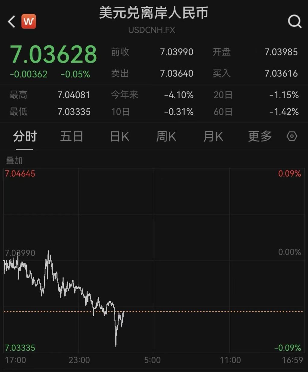 離岸市場上,截至發稿,更多反映國際投資者預期的離岸人民幣對美元匯率盤中最高升至7.03335,較前一交易日7.0399的收盤價小幅走高。