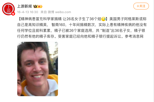 美國一男子謊稱自己是科學家,智商高達160,在十年間捐獻多次,為26個家庭帶來36個孩子。
