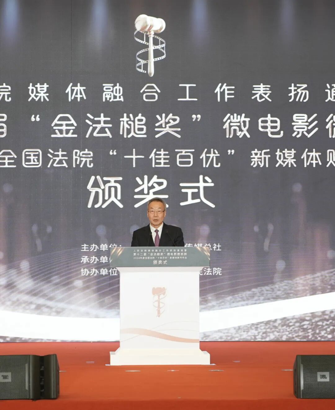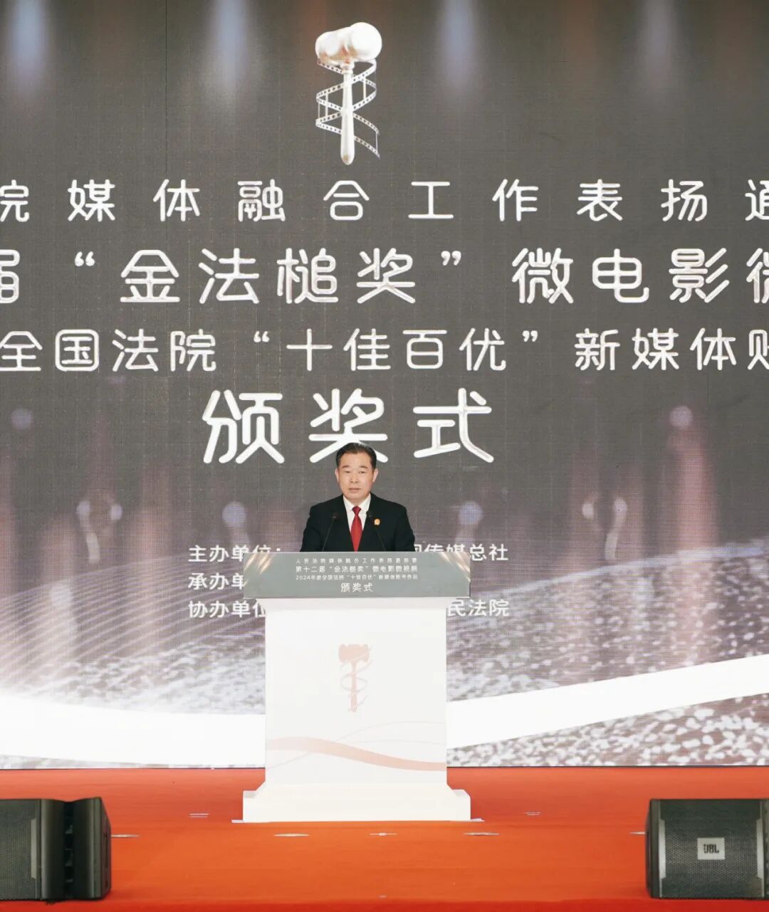 人民法院媒體融合工作表揚通報暨第十二屆“金法槌獎”微電影微視頻、2024年度全國法院“十佳百優”新媒體賬號作品頒獎式現場。