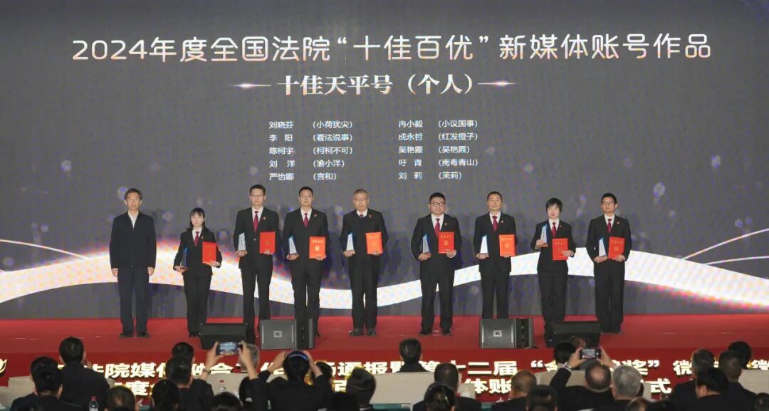 全國法院“十佳百優”新媒體賬號作品推選活動已開展七年,頒獎式現場,當2024年度全國法院“十佳新媒體作品”“十佳客戶端賬號”“十佳微博賬號”“十佳微信賬號”“十佳天平號(個人)”“十佳天平號”獲獎名單陸續在大屏幕滾動出現時,現場頻頻亮起閃光燈。