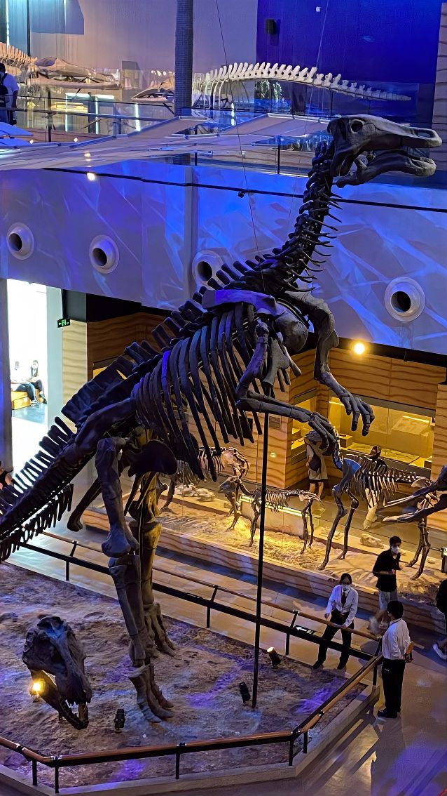 38米長的巨型汝陽龍昂首挺立,作為世界已知最粗壯的恐龍,其龐大身軀足以讓觀者屏息;而一旁的迷你豫龍僅有柴雞大小,這個世界最小的竊蛋龍化石,用反差萌訴說著史前生命的多樣。