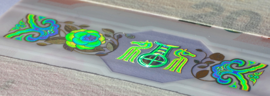 位于票面下方。改變觀察角度,票面正面可見“如意云紋”、“山茶花”與“福”字組成的裝飾紋樣呈現多色動感特征。“福”字下部“田”字內可見立體動感高亮圓環效果。防偽特征效果見圖6。