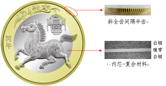 硬幣外環為黃銅合金,內芯為具有獨特機讀性能的鎳帶復合白銅材料。防偽特征效果見圖1。