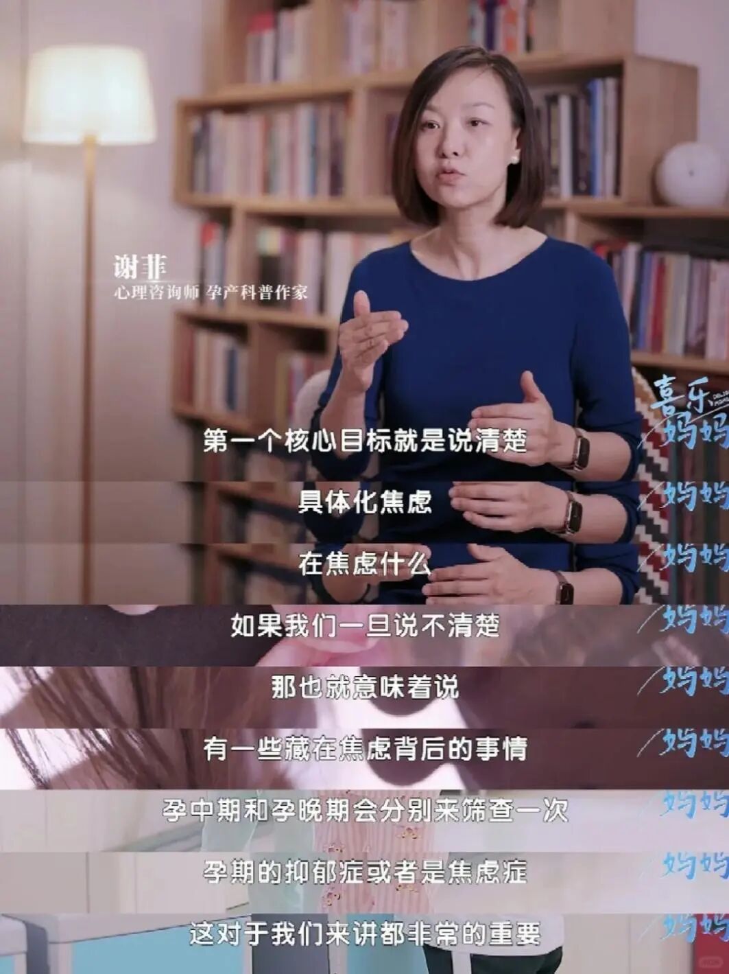 心理咨詢師、孕產科普作家謝菲在紀錄片《喜樂媽媽》中指出:“對于產后焦慮,必須找到具體化的焦慮對象。”