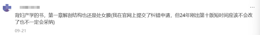 更令人鼓舞的是,一些女性不僅在日常交流中反思語言,也開始挑戰權威文本中的過時表述。一名網友在學習醫學教材中,發現書本里仍沿用“處女膜”一詞,便正式提交糾錯建議,呼吁使用“陰道瓣”等準確的表達。