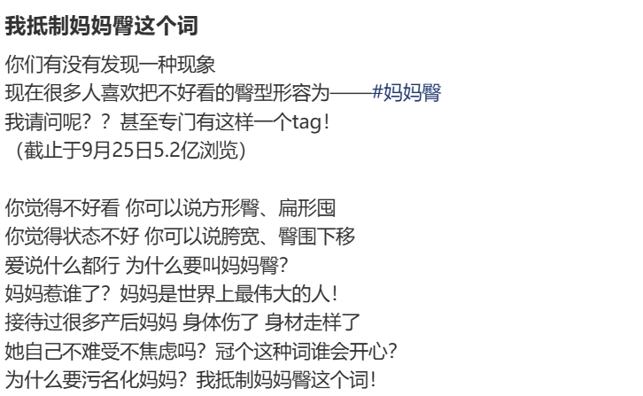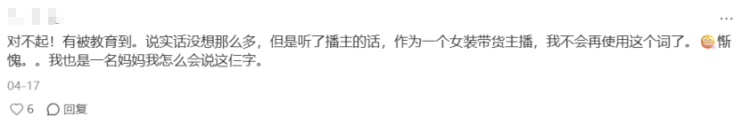另一條關于“拒絕使用‘媽媽臀’”的帖子下,一名帶貨主播反思道:“我也是媽媽,怎么會脫口而出這三個字”,她隨即表示今后不再使用這一帶有貶義的標簽。
