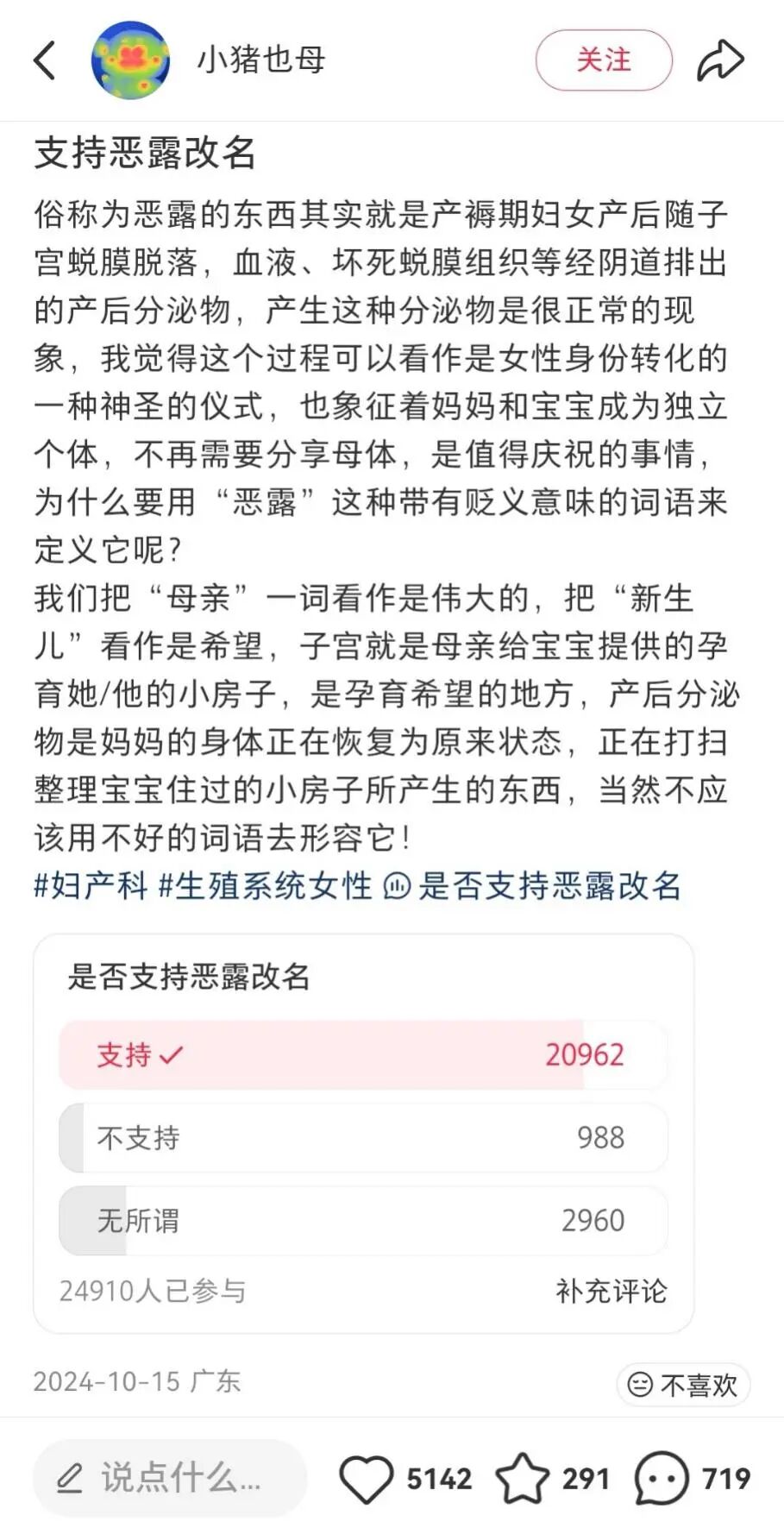 比如,網友“小豬也母”發起的改名投票中,超過兩萬人支持更名,帖子收獲五千余點贊,評論區里,許多女性坦言:“惡露二字總讓我聯想到不潔和羞恥,仿佛生完孩子身體就不干凈了。”于是,她們提出“產后露”“產后脫落物”“產經”等更客觀、中性的替代詞。