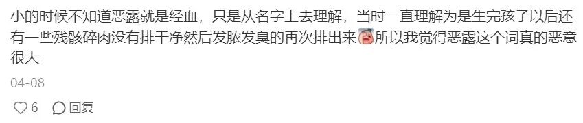 而對于剛經歷生產的女性,產后恢復期的身體疲憊和心理負擔本就沉重,再聽到“惡露”一詞,無疑是雪上加霜。2019年《醫學人文期刊》發布的調查顯示,15%的產婦認為“惡露”一詞加重了她們的產后焦慮。而網絡平臺上的討論表明,許多女性認為這個詞帶有誤導性,讓她們誤以為自己患病了。