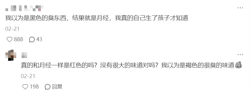 語言帶來的心理暗示,在未育女性群體中尤為明顯。由于缺乏親身體驗,她們對“惡露”的想象往往通過道聽途說或碎片化信息構成,加深了她們對生育的恐懼,還可能引發自我貶低情緒,如“我的身體很臟”等。這無疑成了未育女性心中難以跨越的一道心理門檻。