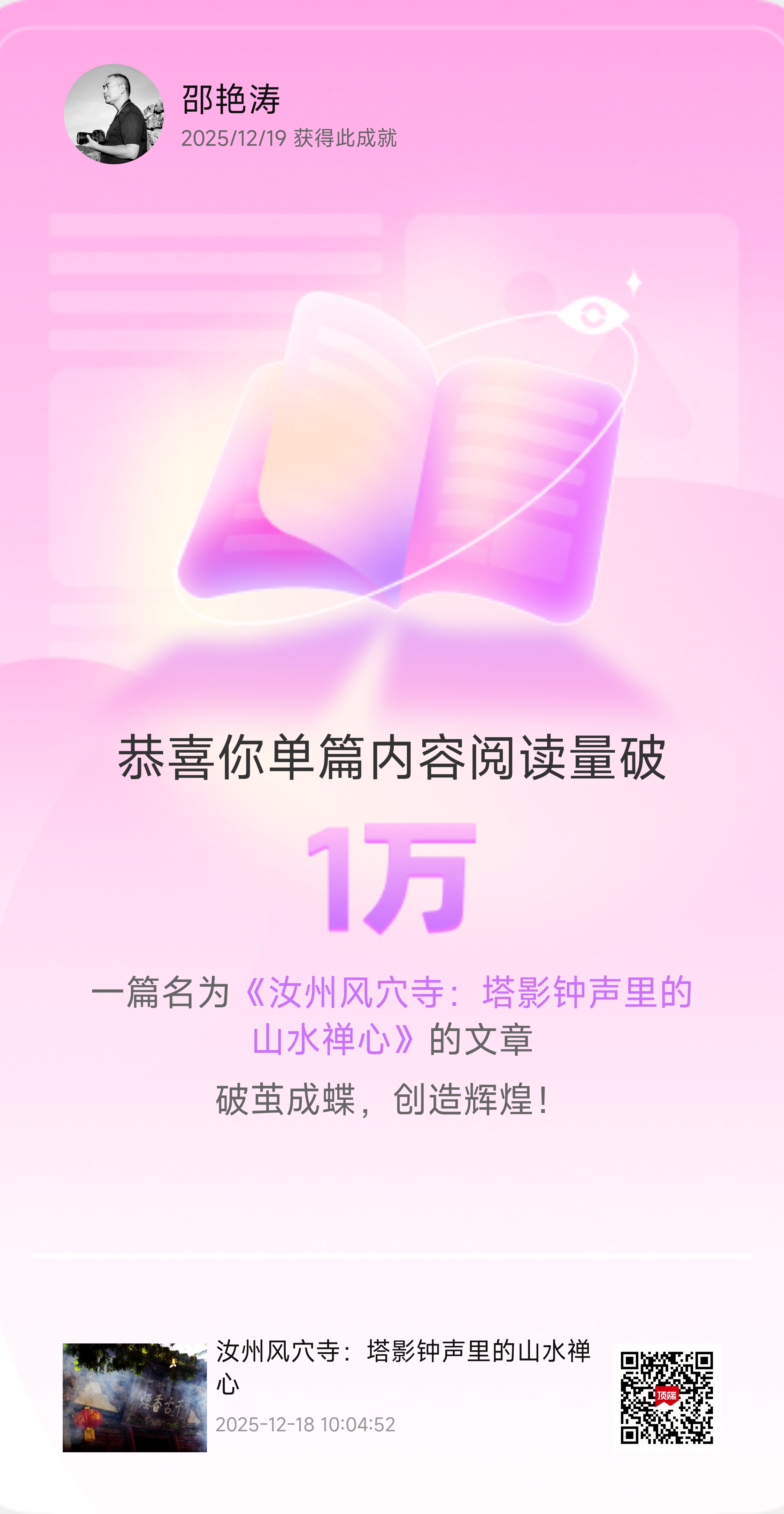 2025年12月19日,我的文章《汝州風(fēng)穴寺:塔影鐘聲里的山水禪心》迎來了單篇閱讀量破萬的成就!從落筆寫下風(fēng)穴寺的山水禪意,到被上萬讀者看見,這份認(rèn)可讓我覺得所有的文字打磨都值得。破繭成蝶的喜悅,也讓我更堅(jiān)定了用文字記錄美好、傳遞文化的初心