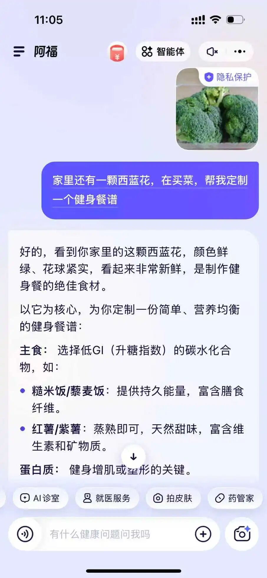 可以上傳飲食照片、運(yùn)動記錄或體檢報(bào)告,阿福可以幫你記錄每日飲食,分析熱量和營養(yǎng)素?cái)z入,確保在控制熱量的同時(shí)保證營養(yǎng)均衡。還可以根據(jù)您的口味和需求,定制合適的健康食譜。