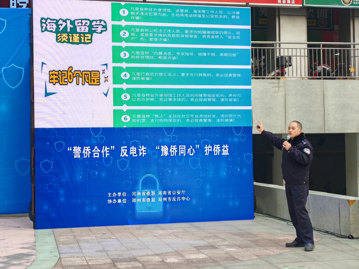 為切實提高廣大僑界群眾和海外僑胞識詐防詐能力,守護好人民群眾的“錢袋子”,12月19日,河南省僑聯聯合省公安廳在鄭州市金水區豐產路街道辦姚砦社區組織開展“警僑合作”反電詐 “豫僑同心”護僑益活動。