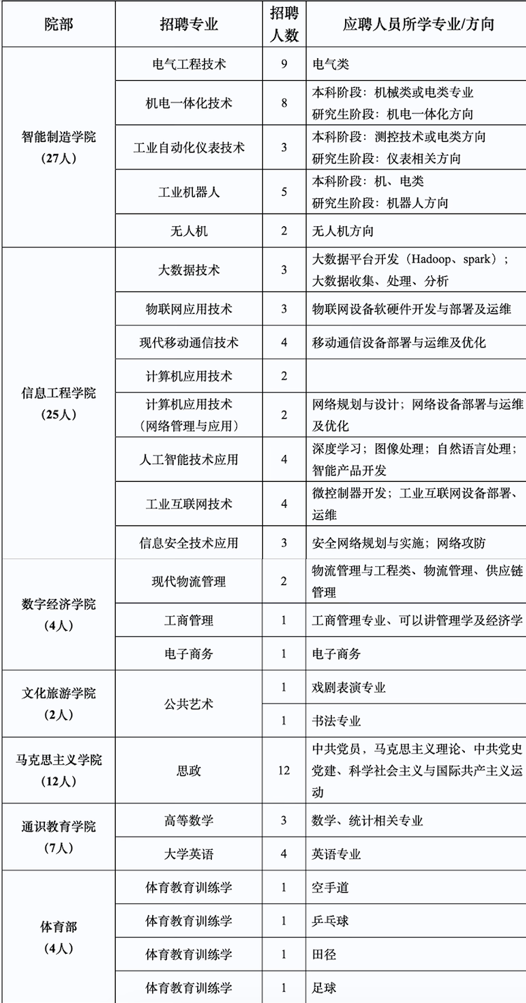 學校現(xiàn)有智能制造學院、信息工程學院、數(shù)字經(jīng)濟學院、文化旅游學院、馬克思主義學院、通識教育學院、體育部及中專部8個教學單位。開設(shè)有電氣自動化技術(shù)、建筑工程技術(shù)、機電一體化技術(shù)、工業(yè)自動化儀表技術(shù)、工業(yè)機器人技術(shù)、大數(shù)據(jù)技術(shù)、現(xiàn)代移動通信技術(shù)、物聯(lián)網(wǎng)應用技術(shù)、計算機應用技術(shù)、人工智能技術(shù)應用、工業(yè)互聯(lián)網(wǎng)技術(shù)、大數(shù)據(jù)與會計、電子商務、現(xiàn)代物流管理、數(shù)字媒體藝術(shù)設(shè)計、刺繡設(shè)計與工藝、空中乘務、民航安全技術(shù)管理、視覺傳達設(shè)計、舞蹈表演、體育保健與康復21個專業(yè)。