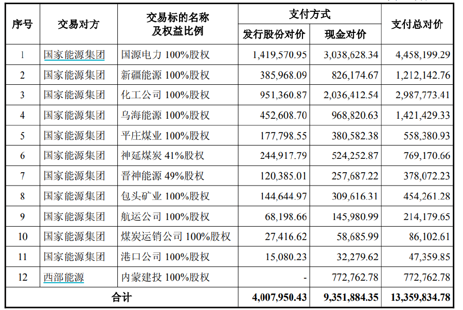 【大河財(cái)立方消息】12月19日晚間,中國(guó)神華發(fā)布公告稱,公司擬通過(guò)發(fā)行A股股份及支付現(xiàn)金的方式購(gòu)買(mǎi)國(guó)家能源集團(tuán)持有的國(guó)源電力100%股權(quán)、新疆能源100%股權(quán)、化工公司100%股權(quán)、烏海能源100%股權(quán)、平莊煤業(yè)100%股權(quán)、神延煤炭41%股權(quán)、晉神能源49%股權(quán)、包頭礦業(yè)100%股權(quán)、航運(yùn)公司100%股權(quán)、煤炭運(yùn)銷(xiāo)公司100%股權(quán)、港口公司100%股權(quán),并以支付現(xiàn)金的方式購(gòu)買(mǎi)西部能源持有的內(nèi)蒙建投100%股權(quán);同時(shí),上市公司擬向不超過(guò)35名特定投資者發(fā)行A股股份募集配套資金。