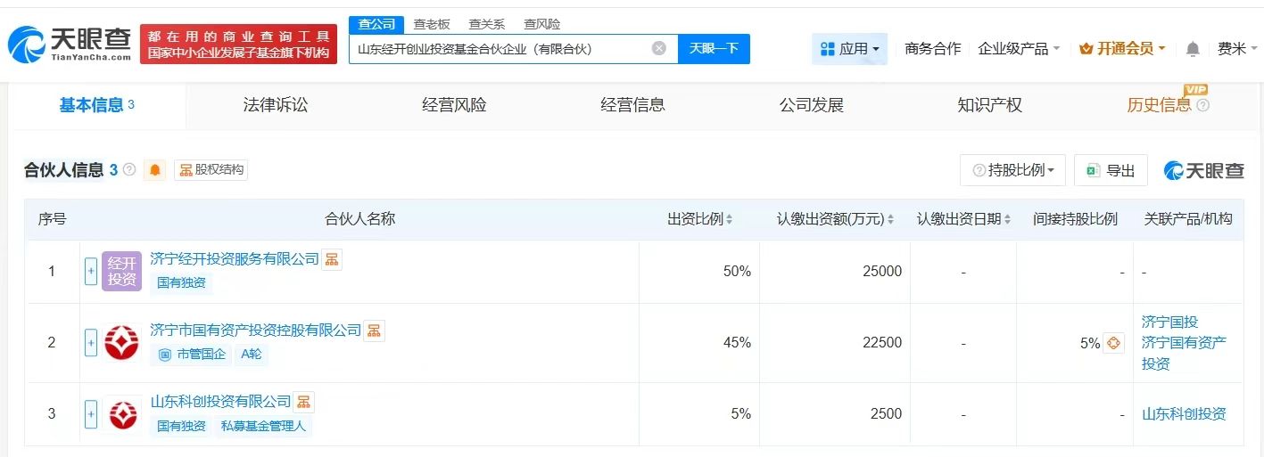 天眼查App顯示,近日,山東經開創業投資基金合伙企業(有限合伙)成立,執行事務合伙人為山東科創投資有限公司,出資額5億人民幣,經營范圍為以私募基金從事股權投資、投資管理、資產管理等活動,創業投資,以自有資金從事投資活動,由濟寧經開投資服務有限公司、濟寧市國有資產投資控股有限公司、山東科創投資有限公司共同出資。