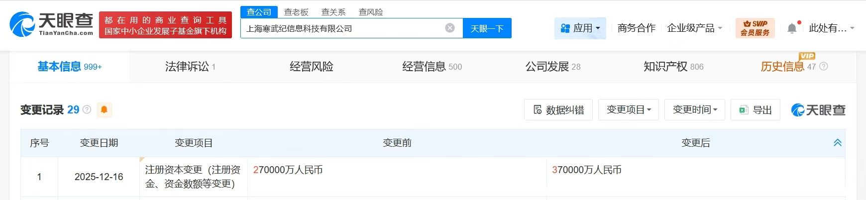 天眼查App顯示,近日,上海寒武紀信息科技有限公司發生工商變更,注冊資本由27億人民幣增至37億人民幣,增幅約37%。