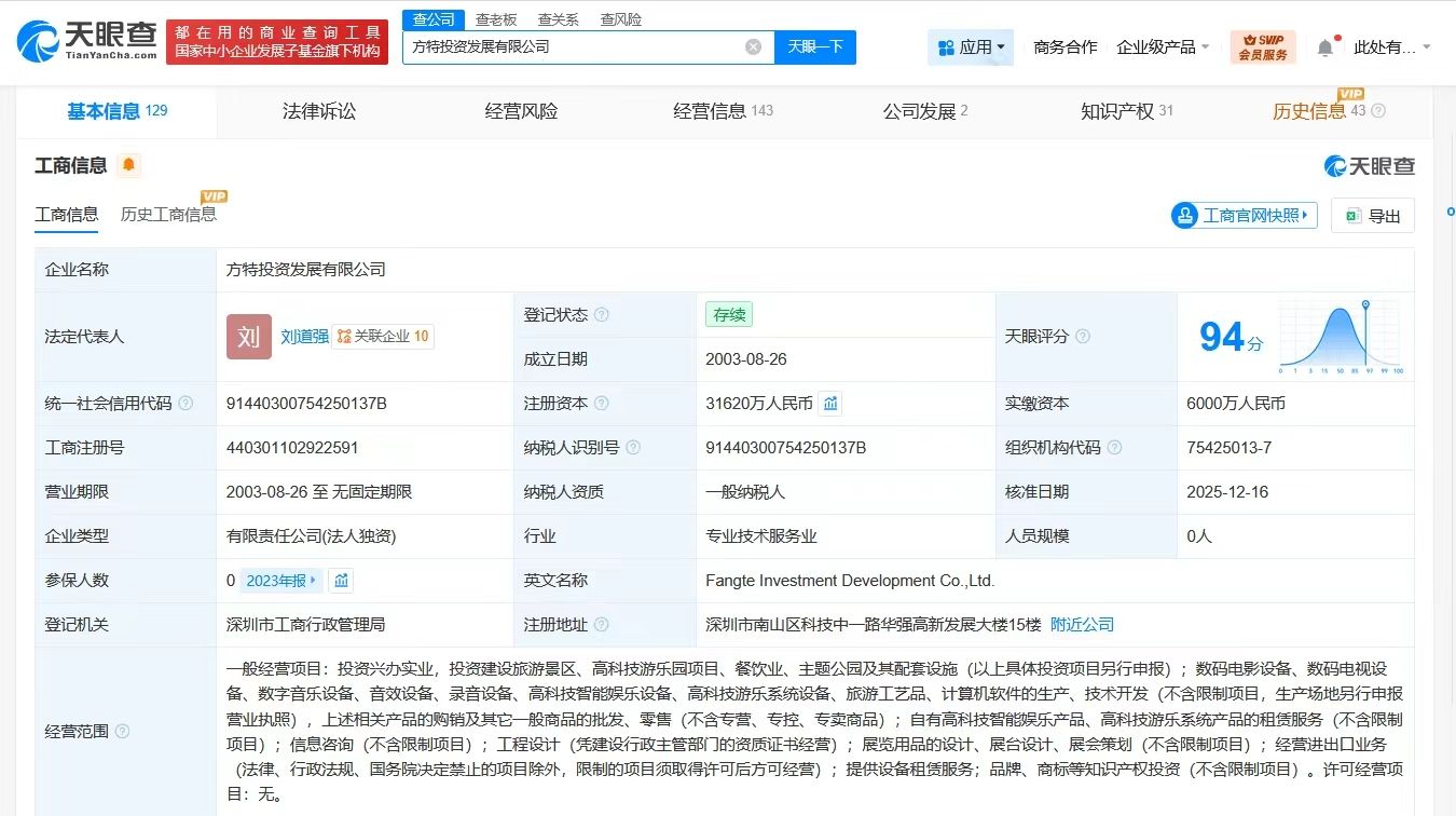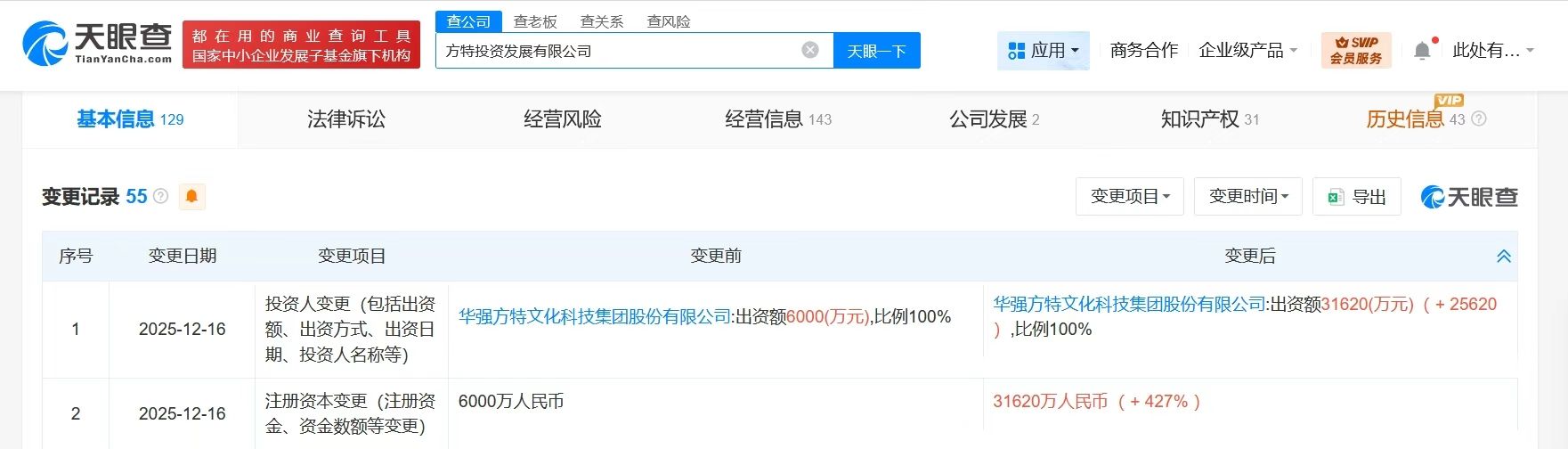 天眼查App顯示,近日,方特投資發展有限公司發生工商變更,注冊資本由6000萬人民幣增至約3.2億人民幣,增幅427%。