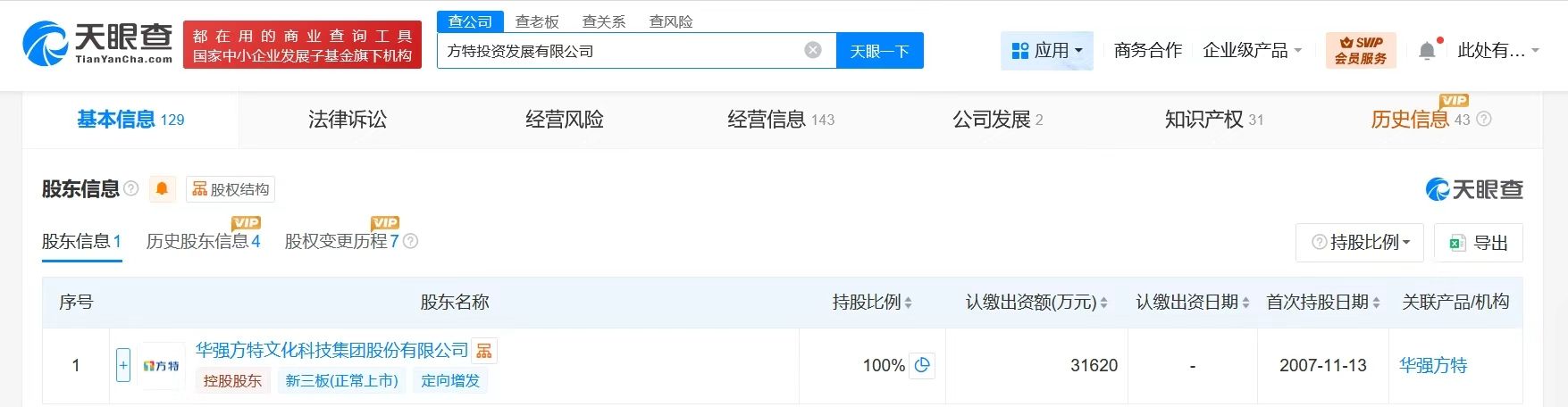 該公司成立于2003年8月,法定代表人為劉道強,經營范圍含投資興辦實業,投資建設旅游景區、高科技游樂園項目、餐飲業、主題公園及其配套設施,信息咨詢,工程設計等,由華強方特文化科技集團股份有限公司全資持股。