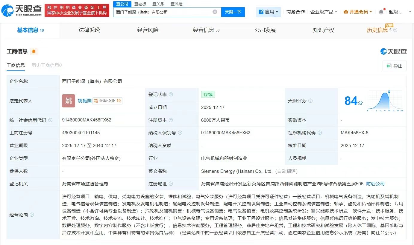天眼查工商信息顯示,近日,西門子能源(海南)有限公司成立,法定代表人為姚振國,注冊資本6000萬人民幣,經(jīng)營范圍包括機(jī)械電氣設(shè)備制造、汽輪機(jī)及輔機(jī)制造、電氣信號設(shè)備裝置制造、發(fā)電機(jī)及發(fā)電機(jī)組制造等。股東信息顯示,該公司由西門子能源有限公司全資持股。