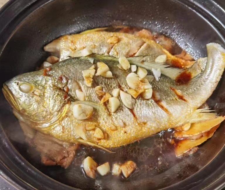 3、屆時(shí)把魚放里邊,料汁淋到表面,蓋住燜半小時(shí),令其熟透,最后可以再撒點(diǎn)小蒜苗,小米椒來(lái)增香。
