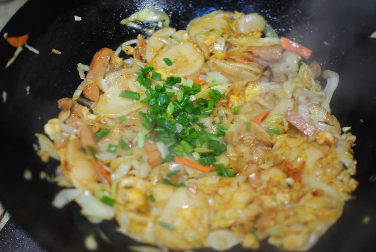 4、青菜塌生后,淋入一點(diǎn)生抽,蠔油,年糕倒進(jìn)去,雞蛋也放里邊,些許鹽撒進(jìn)去,快速炒入味,撒點(diǎn)小香蔥出鍋。