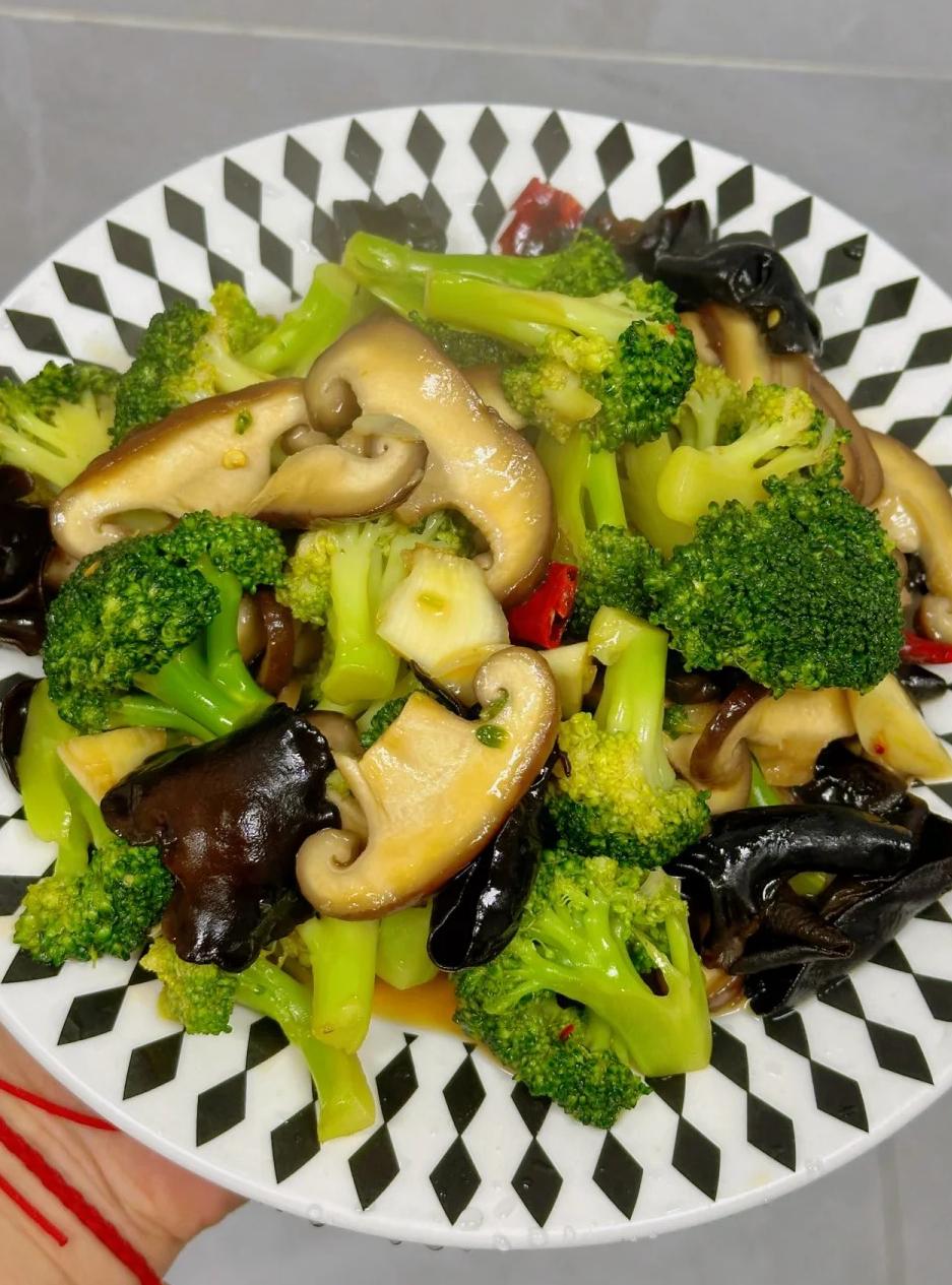 第三道:木耳西蘭花炒香菇 —— 素食者的“血管清道夫”