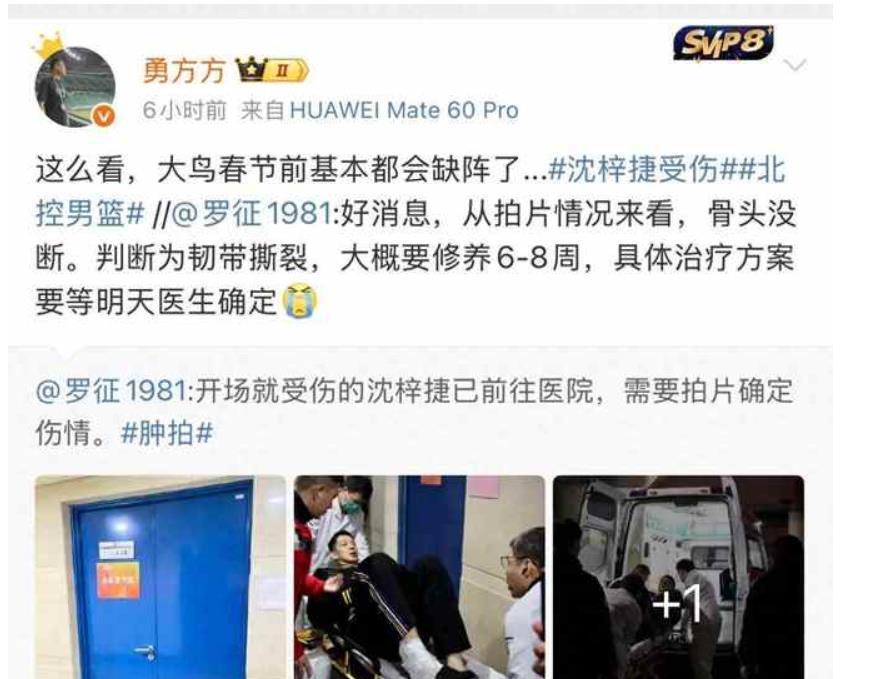 根據直播吧記者的消息,初步的結果是沈梓捷骨頭沒事,但是韌帶有撕裂,這已經是不幸中的萬幸。目前為止北控男和沈梓捷團隊都沒有公布他具體需要休戰多久,也沒有公布他是否需要手術治療的消息,從直播鏡頭來看傷的并不是很嚴重,但是有媒體人預測他會傷停6-8周的時間,至少春節前是無法上場比賽了。