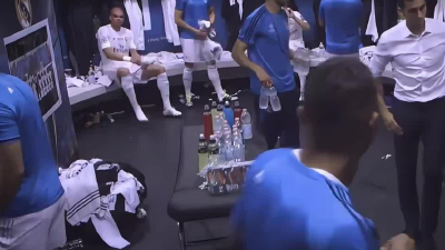 這是皇馬在歐冠決賽中場休息的更衣室畫面,C羅累的氣喘吁吁